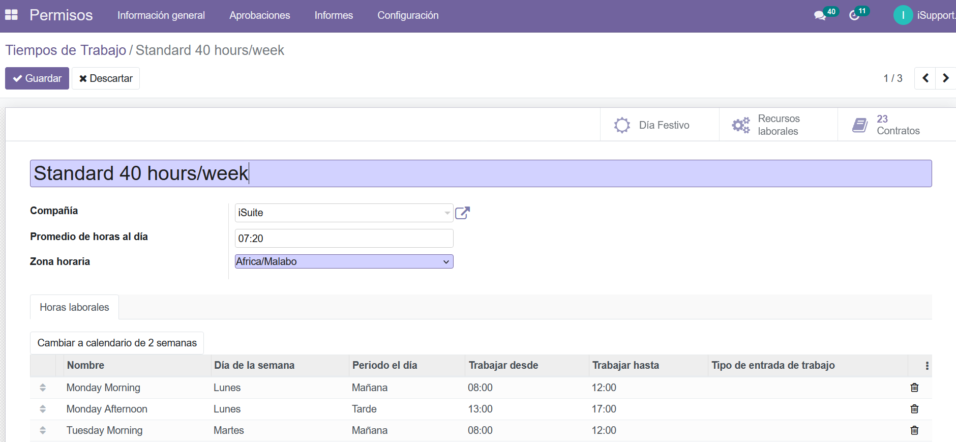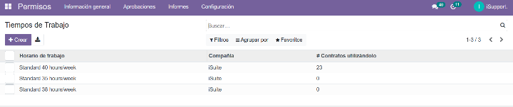 - Horario de Trabajo: El horario de trabajo del empleado, sugerido desde el campo Horario de trabajo en la configuración del Tipo de estructura salarial. También puede elegir otro Horario de trabajo pero este campo debe asegurarse de que es el mismo que el Horario de trabajo en la vista del Empleado.